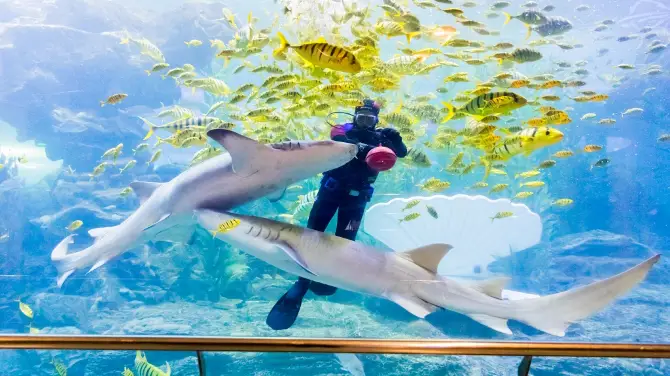 而海洋剧场里的真人水下表演更是备受欢迎,可欣赏惊险的“人鲨共舞”、唯美梦幻的“美人鱼”表演,有时还能看到由潜水员在水下上演的幽默小品。