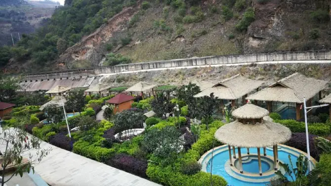 原始部落野温泉度假村位于禄劝县兴隆村与富民县东村镇接壤处的普渡河峡谷边,通往这里的公路都是二级公路,一边是座高山,一边是条小河。