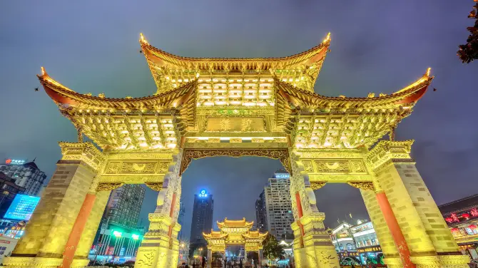 金马碧鸡坊其实是两座牌坊的合称,位于昆明市三市街与金碧路交叉口,始建于明朝宣德年间,如今是昆明的地标和市中心,也是昆明的象征之一。 绝大多数到昆明的游客都会来到这里,和牌坊合影,也逛逛周围的购物中心,晚上这里还有夜市,是品尝美食的好去处。