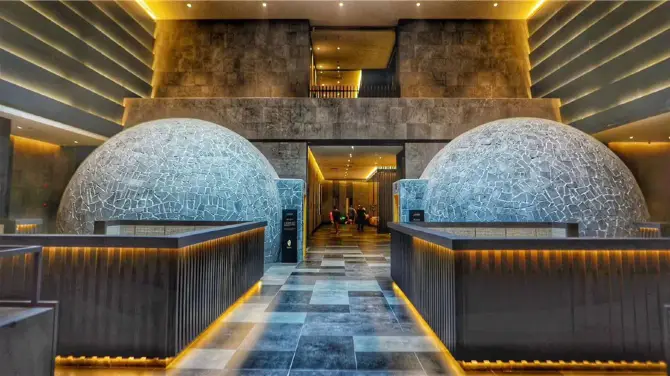 枫叶小镇温泉度假村位于哈尔滨枫叶小镇奥特莱斯北侧,在室内温泉区,规划了38个温泉泡池,构建了超过6000平方米的养生中心。 通过天花造型和室内装饰,配合精心设计的灯光效果,着意营造温馨、舒适、高格调的放松空间。 这里有冰火池、玫瑰花瓣池、五行池和鱼疗池等数十个功能各异的汤池。 德国卡拉卡拉水疗馆使用了正多边形木亭的构造,造型独特,与室外温泉池相辅相成,搭配和谐。 配有先进的深度放松系统,包括超声波躺浴、坐浴、鸭嘴冲击浴、旋流冲击浴、灌顶冲击浴、足底针刺洛等,让你忘却忙碌的都市生活,彻底放松身心。 水疗馆圆形大厅的四壁为玻璃幕墙,环境整洁、通透,打造出无限蓝色空间,沐浴其间可以眺望远方,让身心得到深度放松。
