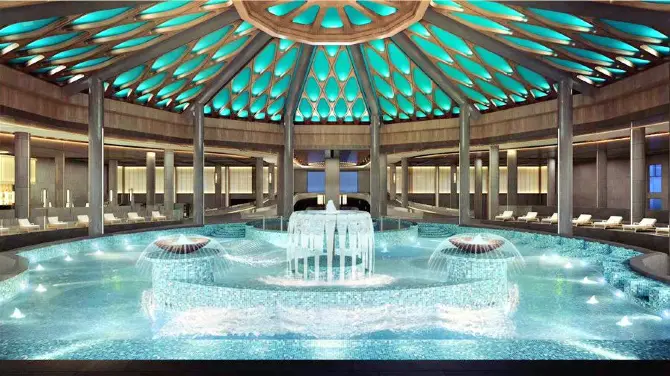 枫叶小镇温泉度假村位于哈尔滨枫叶小镇奥特莱斯北侧,在室内温泉区,规划了38个温泉泡池,构建了超过6000平方米的养生中心。 通过天花造型和室内装饰,配合精心设计的灯光效果,着意营造温馨、舒适、高格调的放松空间。 这里有冰火池、玫瑰花瓣池、五行池和鱼疗池等数十个功能各异的汤池。 德国卡拉卡拉水疗馆使用了正多边形木亭的构造,造型独特,与室外温泉池相辅相成,搭配和谐。 配有先进的深度放松系统,包括超声波躺浴、坐浴、鸭嘴冲击浴、旋流冲击浴、灌顶冲击浴、足底针刺洛等,让你忘却忙碌的都市生活,彻底放松身心。 水疗馆圆形大厅的四壁为玻璃幕墙,环境整洁、通透,打造出无限蓝色空间,沐浴其间可以眺望远方,让身心得到深度放松。
