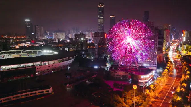长沙摩天轮建造在巨型屋顶上,摩天轮的顶部距离地面约120米。 在摩天轮里向东可看到长沙大学、世界之窗和星沙经济开发区,向南可看到南郊公园,向西可看到岳麓山,向北可看到开福区政府。 夜晚时,摩天轮会发出彩光,摩天轮中心的转轴与外圈都设置了灯光,随着摩天轮的转动,会变换着颜色。